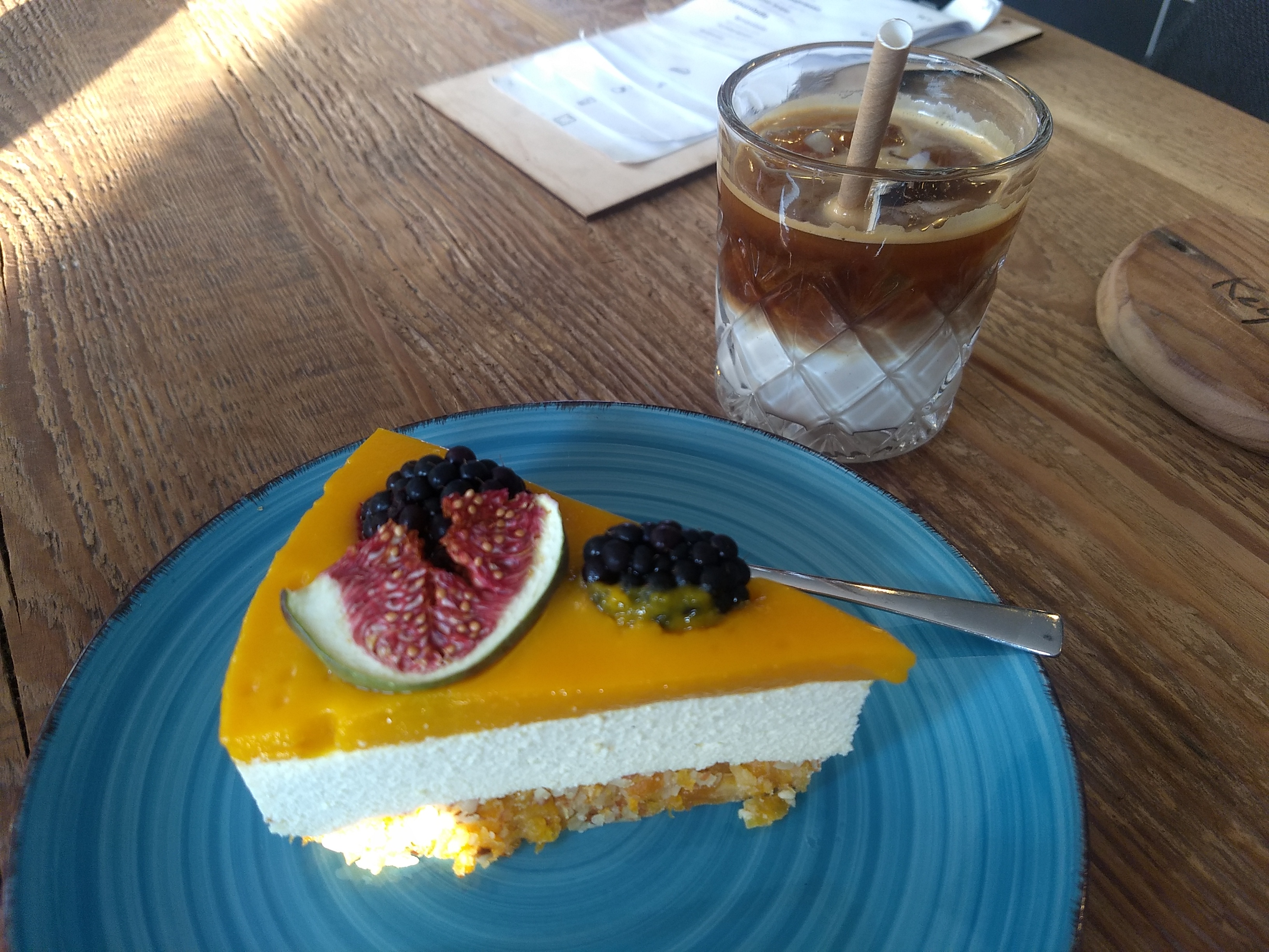 Slightly cooler we drove on to Koszalin to see the Dancing Fountains. Predictably Ernest joined the children in darting through the fountain and I walked Jasper and Mabel through it but they weren’t as keen. Hitting the Happy Cow app again we walked to a lovely modern cafe called Powidoki for yet more iced coffee and vegan cake. It’s definitely been harder sourcing vegan options in Poland but it is possible.