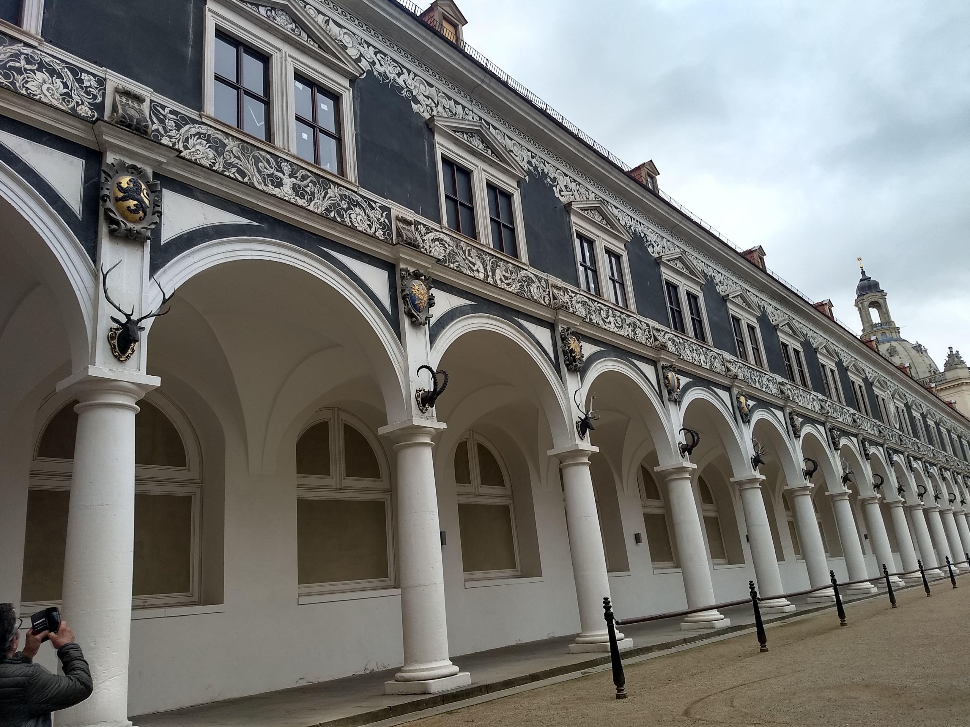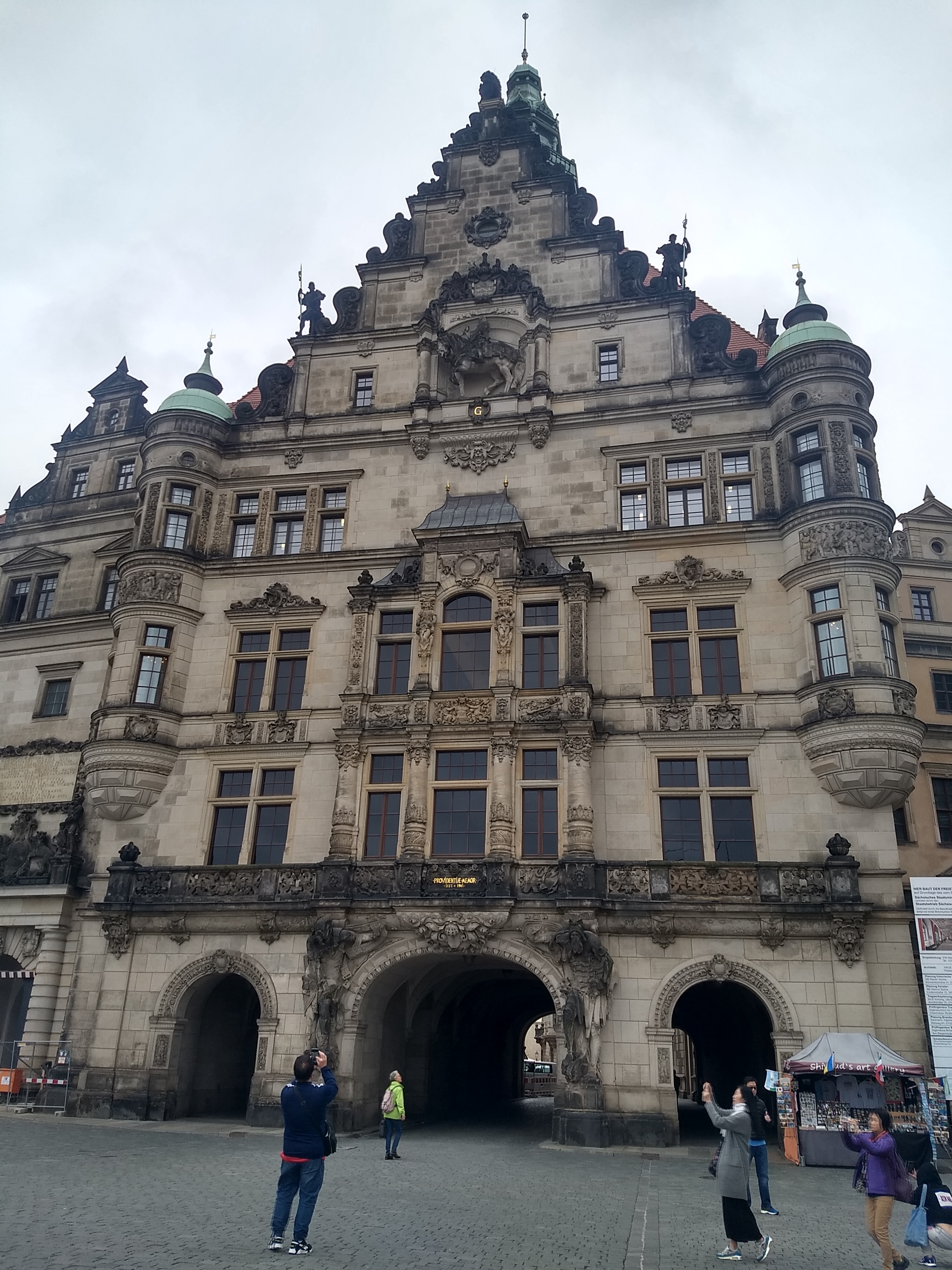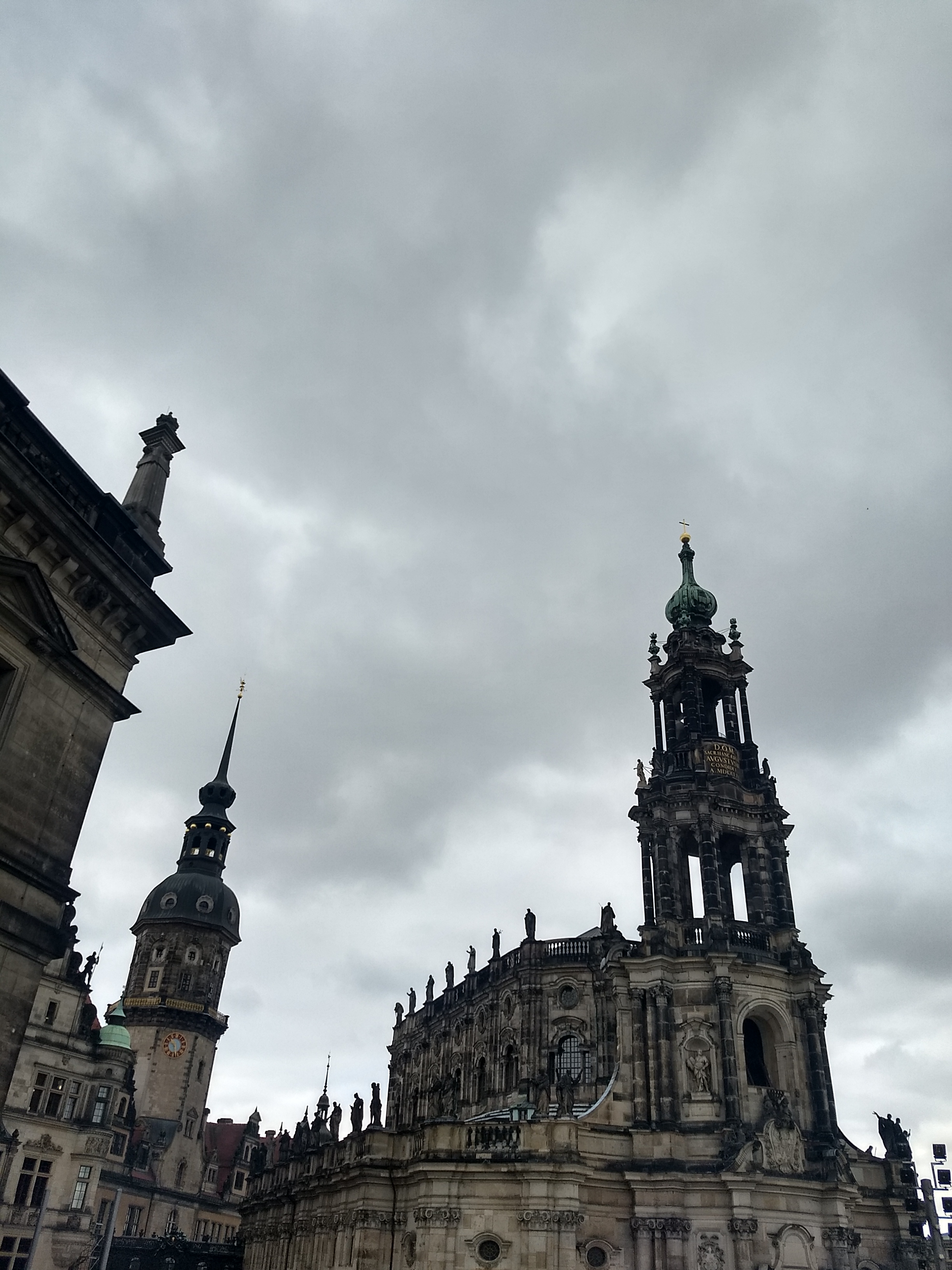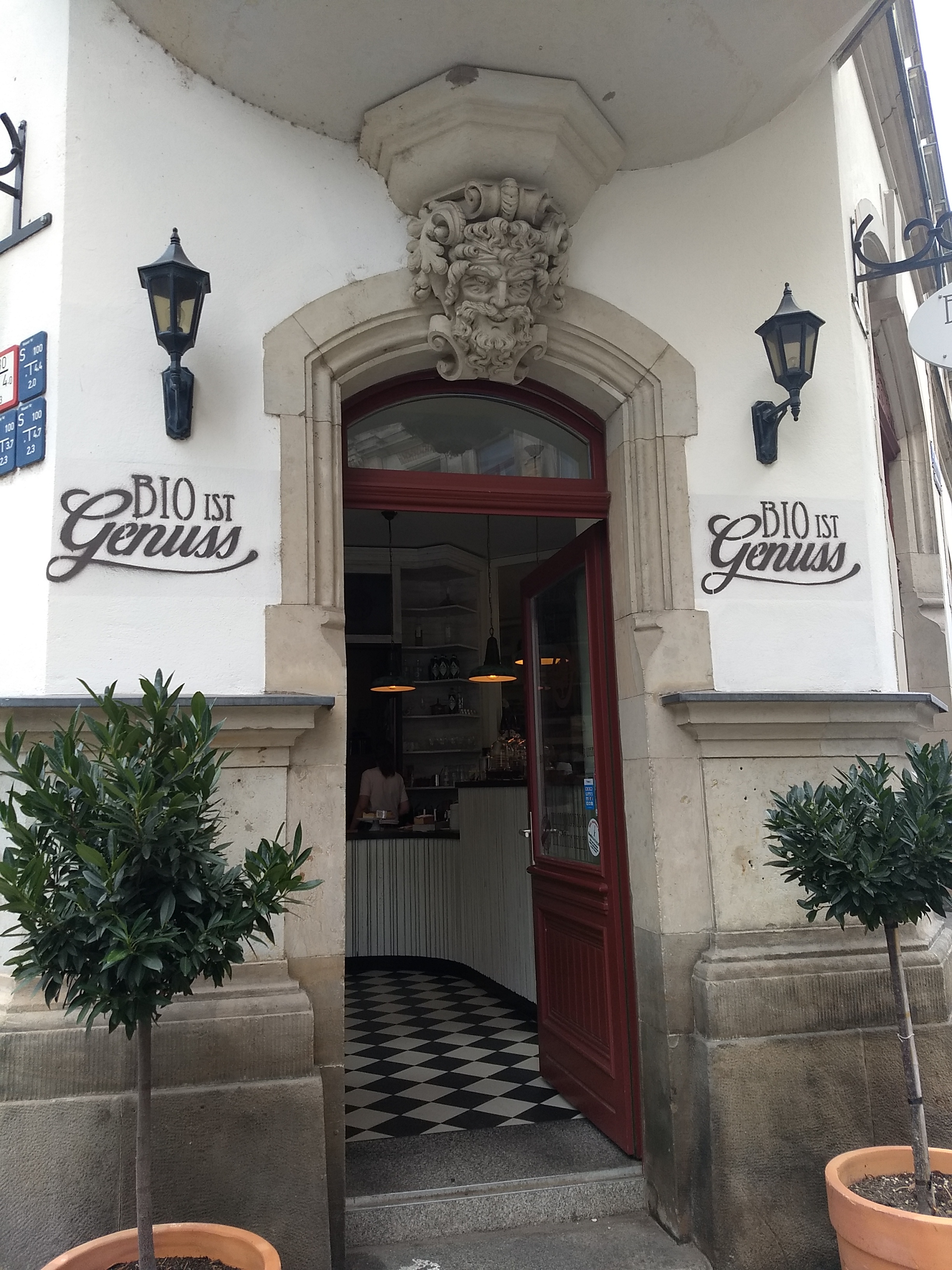 Have you seen the film – The Great Budapest Hotel? If so you may recognise these photos, taken at our first stop of day Molkerie Pfund Café. The downstairs deli is ornately tiled, but the upstairs cafe is rather bland…to be fair most places would be in contrast. There was no vegan option…not even soya milk, so I had to sit patiently while Mark tried the local delicacy Dresden Eierschecke – a light, three layered cake. His review – nice but not outstanding.