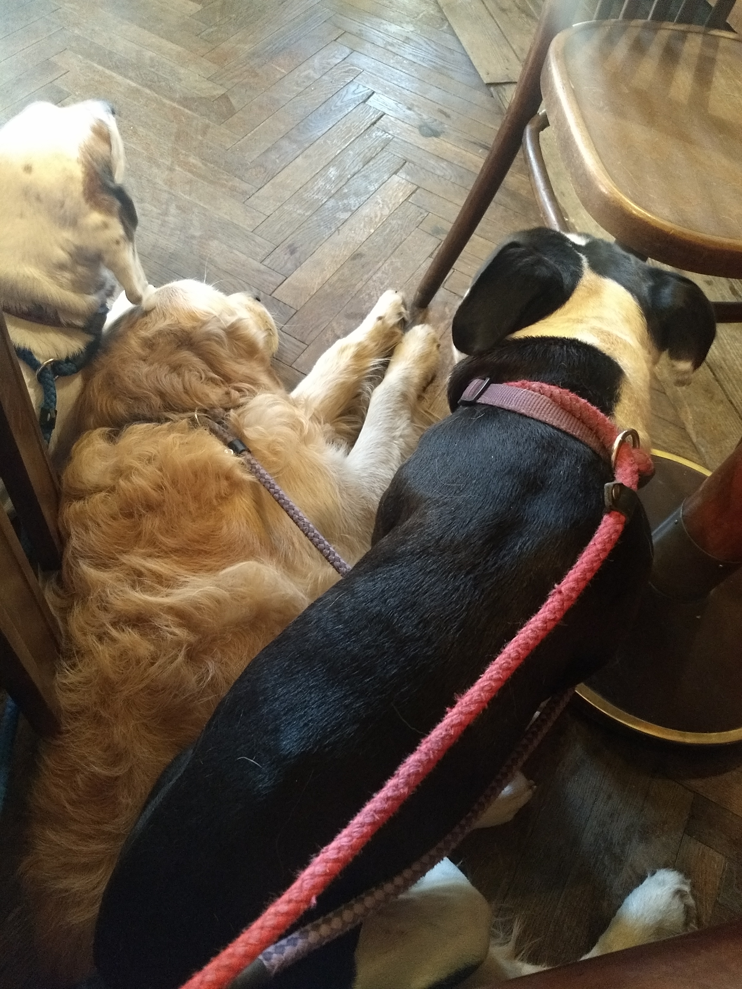 This proved to be fortunate as we went instead to Massolit Books and Cafe which was recommended by a friend. It’s my ideal place…like stepping back in time, with floor to ceiling bookshelves filled with English books – a little taste of home ❤️ The pups were welcomed in, and took up lots of space. We had a lovely coffee and they had a vegan sweet potato bread cake for me, and delicious quiche for Mark. All was going well until 2 other dogs came in and Ernest in his screaming desperation to play, knocked the table and sent a vase of flowers flying to the floor. Which set Mabel off grumbling. While Mark struggled to get them out of the cafe, Jasper calmly wagged his tail and waited for me to clean up, then met the dogs. One out of three ain’t bad 😂🙈