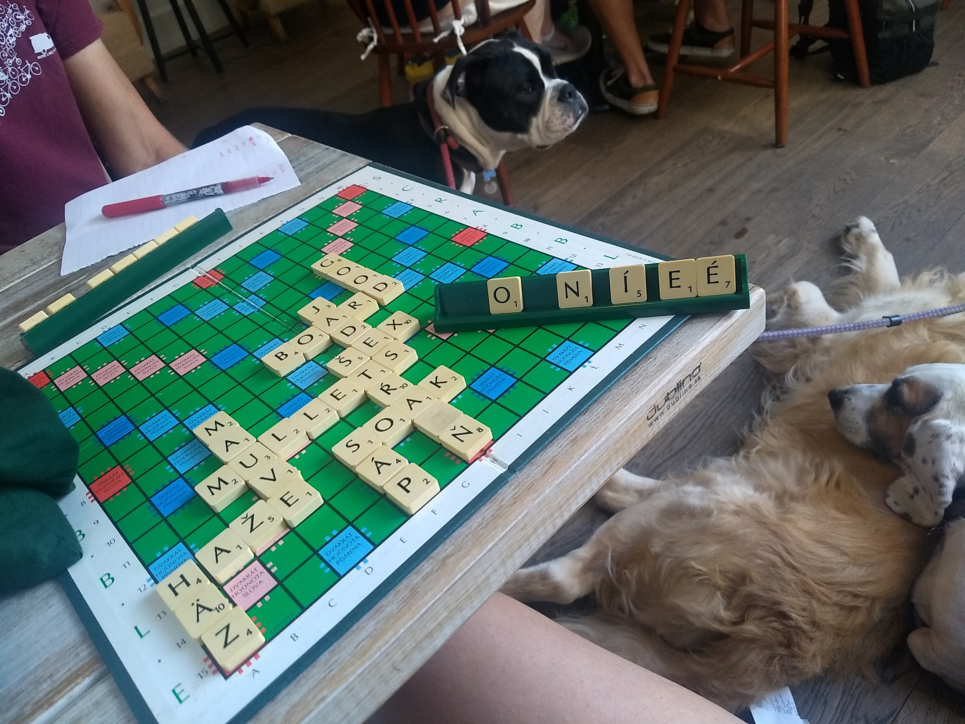 I made spicy tomato soup for lunch before walking the pups along the river and ultimately to another cafe called Coffeein, which was dog friendly and served a range of roasts and coffee makers (could have bought a cafetier from here instead of IKEA!). Despite Mark saying no, we played Scrabble and drank iced coffee. A lovely relaxing afternoon…and I didn’t take too long coming up with words (Mark might disagree π). Playing with a Czech copy certainly made the scoring fun as they had different letters and values.