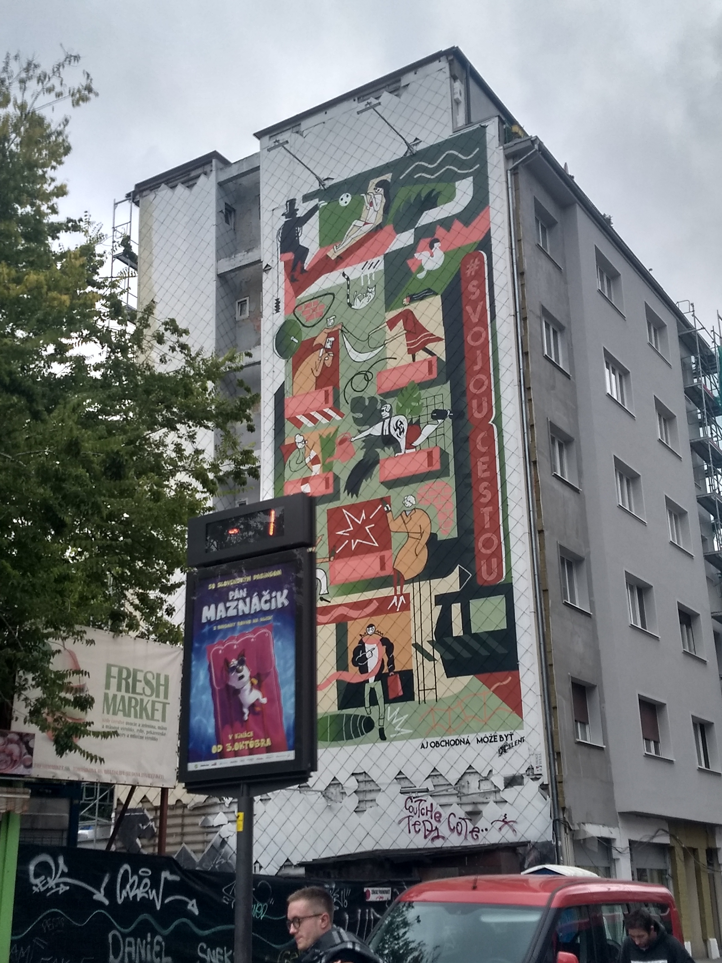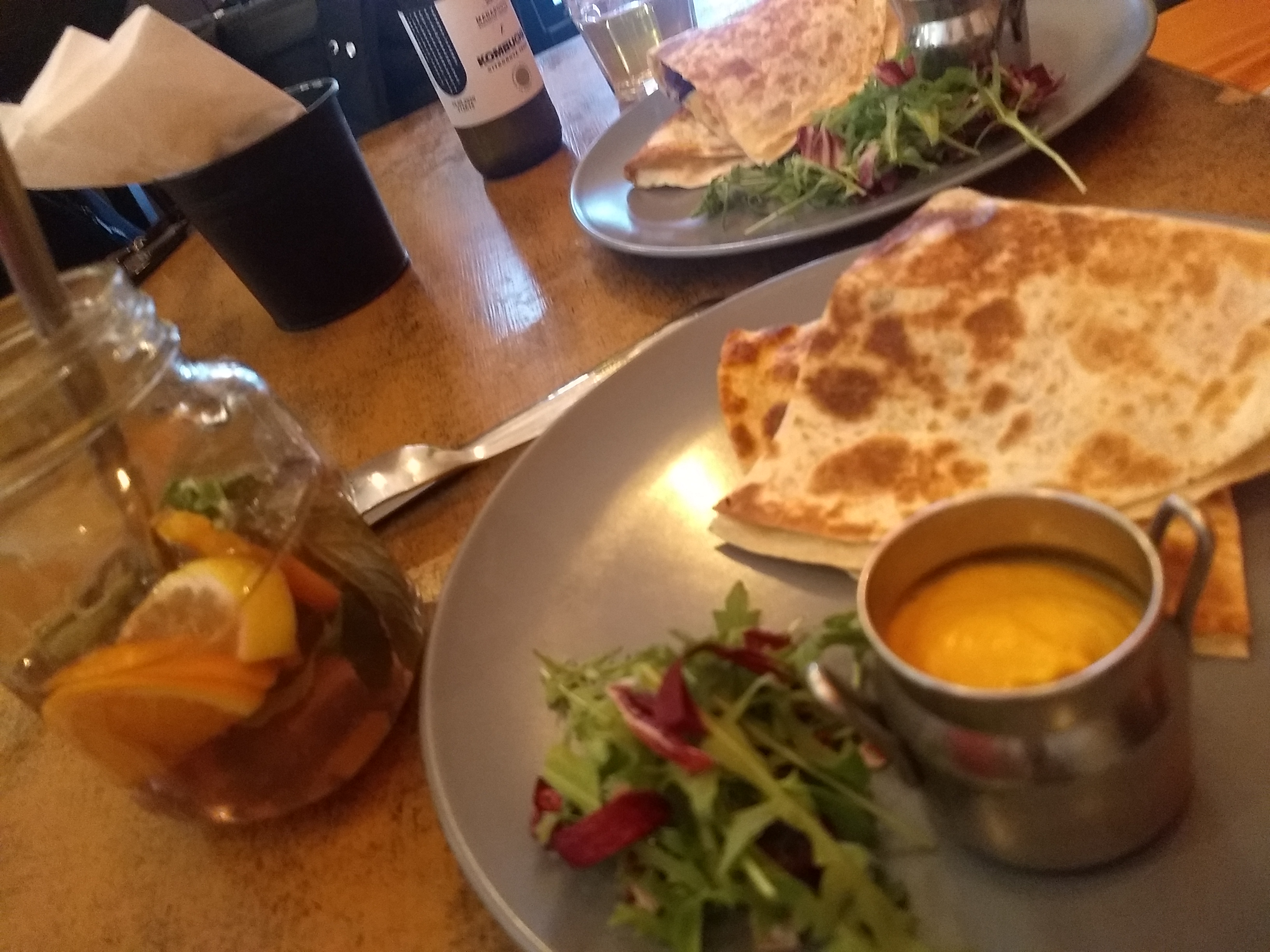 We decide it’s too late for Vienna and it’s easier to find a football pub in Bratislava for tonight’s game (Marks ulterior motives), so instead ventured to a new cafe Literárna čajovňa. It’s themed like a Japanese tea house and much cheaper than in the touristy area (€2.70 for two coffees). We then walked on to a very popular and tasty vegan restaurant called Balans Bistro – we happily shared a table with two others people and opted for Quesadillas which were delicious. The burgers and cakes being delivered also looked scrumptious.