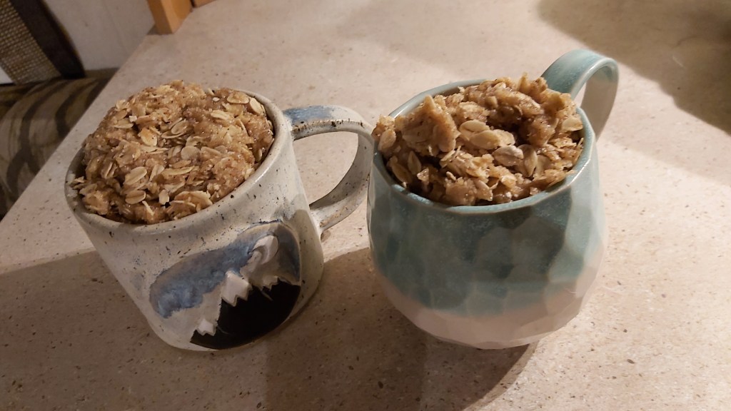 We are both craving apple crumble and to our delight we get free electric here so Mark has popped to the shop for ingredients and I’m going to attempt apple crumble mug cake…it will be the first time we have cooked anything in the microwave 🤞🤣