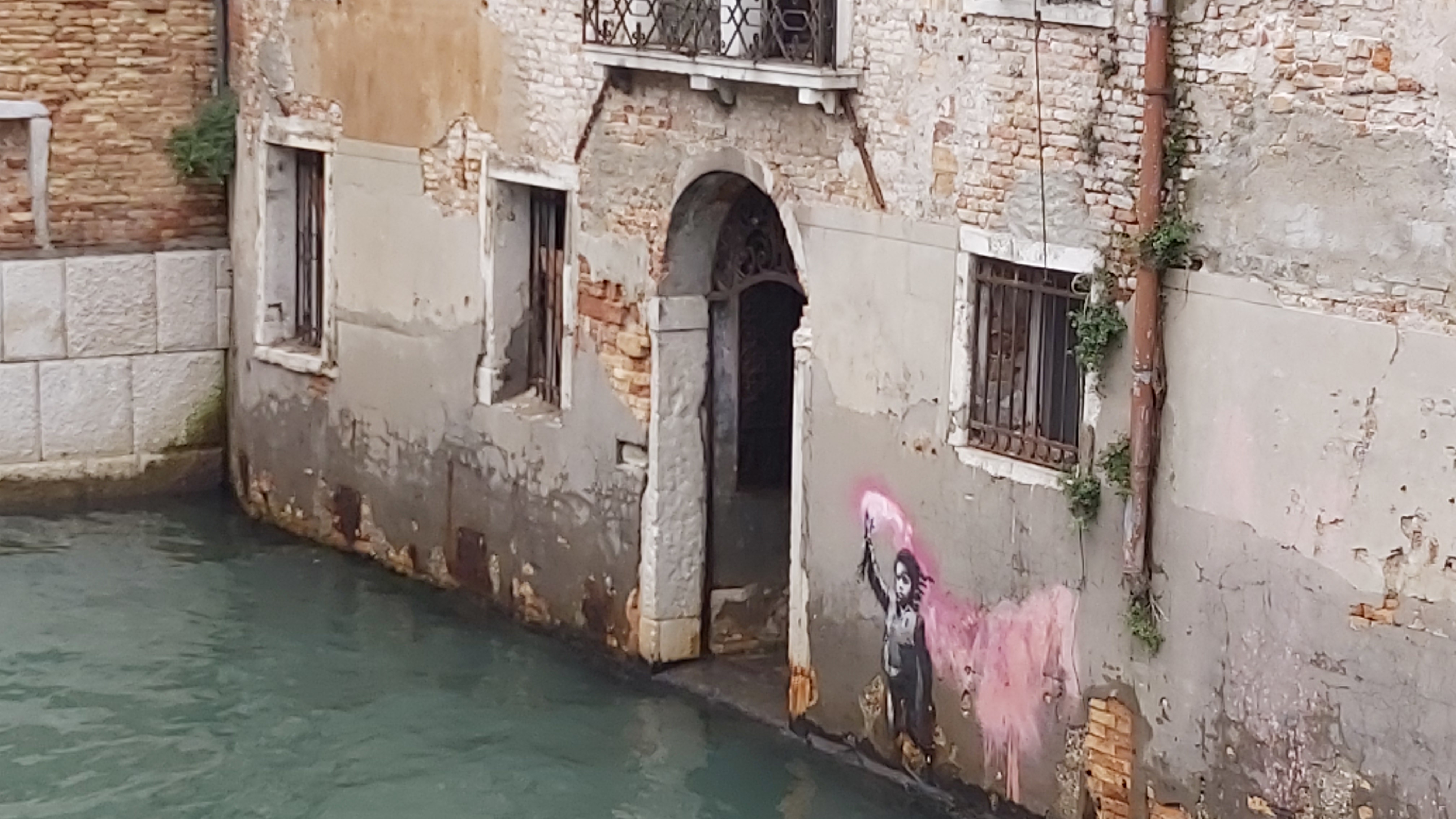 Before heading home I wanted to find Banksy’s poignant venice piece, showing an immigrant child wearing a life jacket, holding a pink beacon. It is so easily missed, and was under water yesterday. Interestingly the house its been painted on has been for sale for years and is crumbling into disrepair, the artwork has likely added value but without its setting its meaning is surely reduced. Besides this, there was little graffiti but those I did see often hinted at venice’s troubled future.