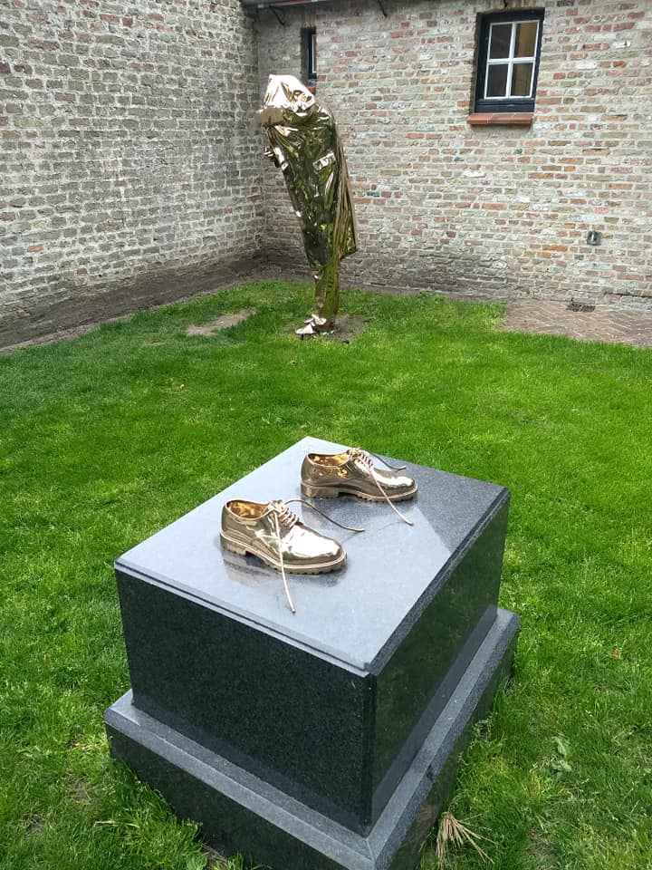A quick peak out the van blind revealed a grey and overcast day, but undeterred we had been recommended a lovely loop walk to see the Bruges windmills and off we went. I loved that even the fence around one had been laced, and I spied a great golden sculpture in a museum garden.